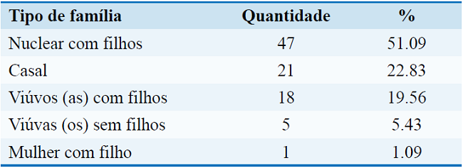 Praticamente todos os escravos de São Cristóvão (307) estavam inseridos em alguma das 92 famílias listadas, ou seja, 93,31% das pessoas estavam ligadas umas às outras ou já haviam tido no passado, como os viúvos (as), algum tipo de família. Dos 329 cativos listados, apenas 22 foram identificados sem indício de ter ou de ter tido no passado algum laço familiar. Era uma mulher solteira e os demais idosos sem parentes. É evidente que este último grupo pode se referir a viúvos (as), aumentando ainda mais o número de pessoas ligadas a famílias, mas como a fonte não deixou isto claro, tomou-se por base que eram pessoas sozinhas. A distribuição por tipo de família pode ser identificada na tabela abaixo (Tabela 1).