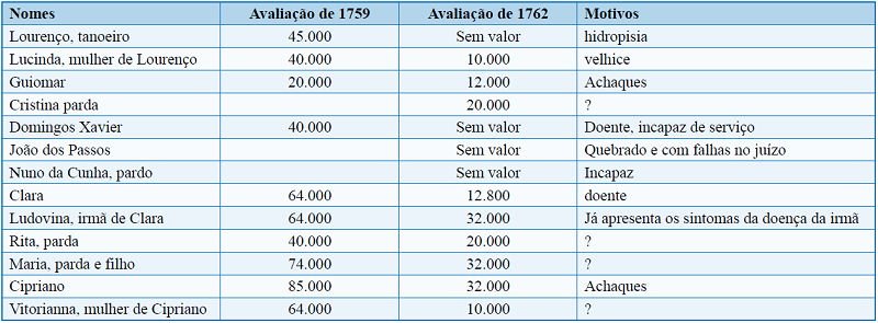 O resultado desta nova avaliação foi que os preços de 13 escravos foram alterados em função de seus estados de saúde e físico. Quatro não tinham mais nenhum valor por estarem incapacitados ou doentes e nove perderam parte de seu valor por estarem com algum tipo de doença. O Quadro 1, adiante, sintetiza essas informações.