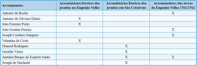 Foram 74 pessoas que arremataram os escravos de São Cristóvão. Dessa lista, pelo menos dez eram foreiros em São Cristóvão ou no Engenho Velho ou ainda, arremataram as terras dessa última propriedade. O Quadro 2, abaixo, ajuda a elucidar essa situação.