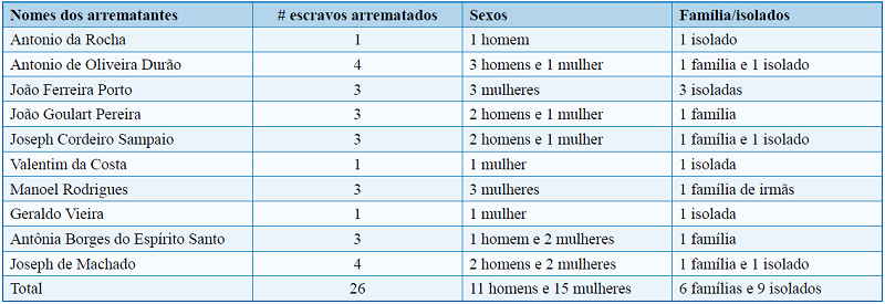 Com relação aos nove escravos que foram arrematados isoladamente, essa percepção fica mais difícil porque foram cinco mulheres e quatro homens, demonstrando um certo equilíbrio nas escolhas. Se a análise for ampliada para todo o conjunto de escravos arrematados, identifica-se que dos 230 escravos, 115 eram mulheres, 106 eram homens e 9 foram identificados como crias, demonstrando novamente um equilíbrio entre os sexos.