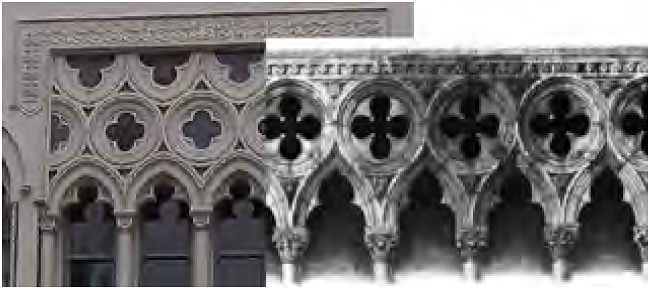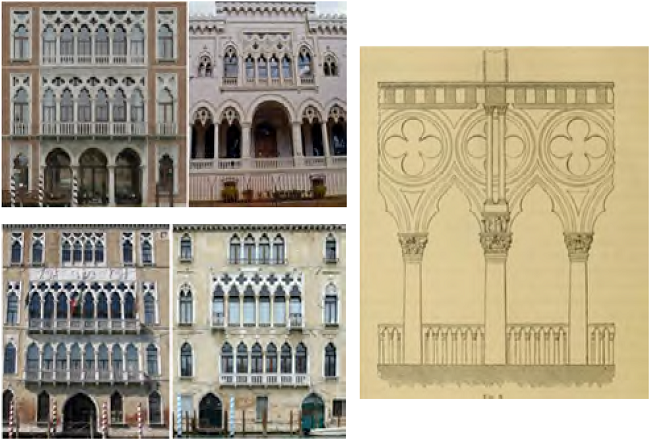 De hecho, ni un sólo elemento ornamental y constructivo utilizado por Petri es exclusivo del palacio Ca’ d’Oro. Un ejercicio de comparativa revela cómo cada arco, tracería, capitel o columna, tiene su parangón en ese y en otros edificios neomedievales italianos, por lo que difícilmente puede defenderse una copia directa. Así por ejemplo, la galería baja con arcos sobre la que se elevan dos crujías articuladas con tracerías en el llamado palacio Genovés de Venecia (1892), obra de Tricomi Mattei, se acerca a las soluciones del palacio Vergara, al igual que la tracería de cinco arcos del palacio Ca’ Foscari (1452-1457) o la galería del palacio Benardo (1442), que confirman la polivalencia de las soluciones de Petri, que no remiten nunca a un tipo específico (Fig. 3).