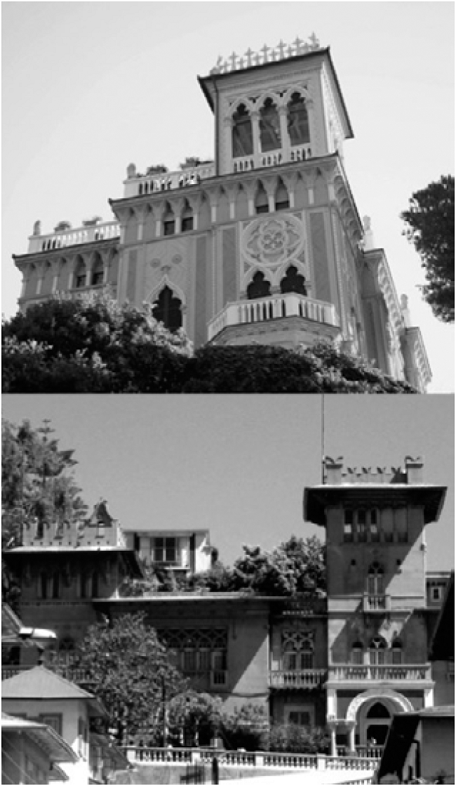 Ambos proyectos se alejan de la paradigmática fachada telón –como en el palacio Vergara de Valparaíso–, componiéndose a partir de la suma de módulos que remata uno de sus extremos mediante una torre articulada con vanos de tracerías caladas (Fig. 9). La construcción italiana posee otras fórmulas presentes en el palacio Valle, tales como los arcos carpaneles con tondos superiores, el uso repetido de balcones y terrazas amplias, estilizadas columnas de fuste sogueado en las esquinas y el taqueado. Incluso las tracerías de los ventanales de la fachada postrera de la villa Luxardo son del todo exactas a las que recorren el gran ventanal del cuerpo intermedio – entre torres – del edificio chileno.