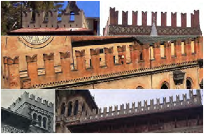 Así se observan, por ejemplo, en los añadidos que Alfonso Rubbiani (1848-1913) realizó en las partes altas de la Loggia della Mercanzia de Bologna o el Palazzo di Re Enzo, inexistentes en la obra medieval original. Una reinvención en toda regla que sería asumida en infinidad de obras medievales restauradas en el norte de Italia, repetida en el palacio dei Notai y el de Accursio de Bologna, y que, finalmente, los arquitectos de principios de siglo asumieron en sus nuevas construcciones como verdaderas, detectándose en los edificios neomedievales de Pietro Fenoglio y su Casa Besozzi, en Torino (1909-1911), o el castello Mackenzie (1897-1902) de Gino Coppedè, en Génova (SHANKEN, 2010).