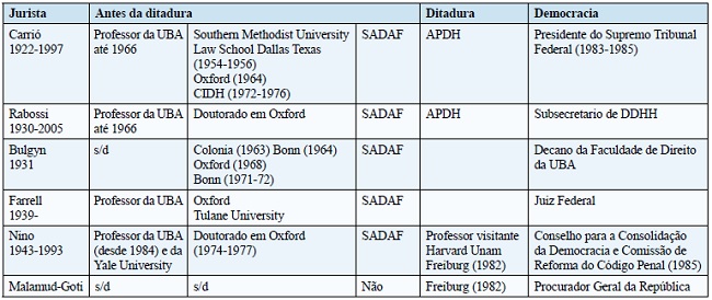 De acordo com o Quadro 1, podemos perceber alguns atributos em comum, que se verificam também nas trajetórias dos outros juristas: a) capital de internacionalização; b) proximidade social, resultante da comum pertença à mesma sociedade científica (SADAF), do ensino na UBA e da passagem por Oxford; c) pertença a associações de direitos humanos; e d) altos cargos ocupados a partir do início da democracia.
