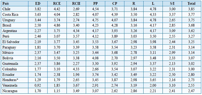 En el campo de la Rendición de Cuentas Interinstitucional (2,65) y a la dimensión del Estado de Derecho (1,29, menor indicador ponderado), es evidente la necesidad de impulsar profundas reformas estatales – e incluso una eventual refundación del Estado hondureño, semejante a lo observado en Ecuador o Bolivia. Finalmente, las dimensiones de resultados y contenidos – Responsividad (2,98), Libertades (3,65), y Solidaridad/Igualdad (2,16) – deberán continuar trabajando en favor de una sociedad más justa, equitativa y republicana.
