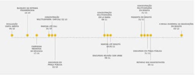 O início da Minga, em 12 de outubro de 2008, mediante a divulgação de uma carta aberta endereçada ao presidente Uribe, revela que esse protesto explorou a tradição reivindicativa conservadora do repertório cultural indígena na Colômbia. No país, em outubro, comemora-se oficialmente o “descobrimento das Américas 31”. Nesse sentido, há que salientar o deliberado direcionamento desse protesto ao sentido histórico das reivindicações indígenas colombianas.