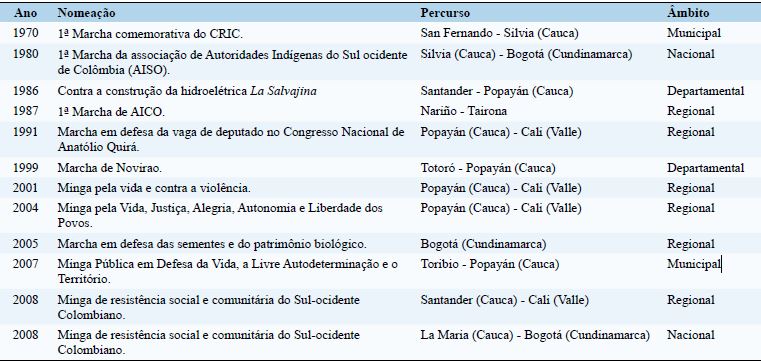 No ano de 2004, na marcha denominada Minga por la Vida, la Justicia, la Alegría, la Autonomía y la Libertad de los Pueblos os marchantes reclamaram respeito pelos direitos indígenas e rejeitaram os tratados econômicos internacionais ( Galeano, 2006). A marcha desdobrou-se na realização do Congreso de Pueblos y Movimientos Sociales, que reuniu aproximadamente 80 mil participantes entre indígenas e outras organizações sociais. Em 2005, a Organização Nacional Indígena de Colômbia (ONIC) 25 convocou a Marcha de la semilla. Mediante esse protesto questionaram a aprovação do Tratado de libre comercio (TLC) entre a Colômbia e os Estados Unidos. Em 2007, o CRIC convocou a marcha chamada Minga Pública em Defesa da Vida, a Livre Autodeterminação e o Território, cujo início ocorreu em Toribio, município que enfrentou vários confrontos armados.