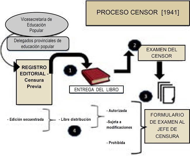 La primera etapa del proceso censor comenzaba cuando el editor o su representante entregaba cinco ejemplares de una obra en el Servicio de Censura de la sede de la Vicesecretaría de Educación Popular o en una de sus delegaciones provinciales. Éste solicitaba el permiso de impresión y señalaba el número de pliegos, los ejemplares de la tirada y la clase de papel que se deseaba emplear, además de dar el nombre y la dirección de la editorial y el título y autor del libro. Frecuentemente aparecían otros datos, como el precio de venta de la obra o su formato. Con todo, hay que considerar que a lo largo de este proceso se podría extraviar la solicitud o aplazarse el análisis de la obra por tiempo indeterminado a causa de ciertas cuestiones, como el simple “descuido o confusión de algún subalterno” o la falta de papel 6.