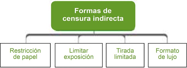 En nuestra investigación, identificamos cuatro formas frecuentes de censura indirecta. Las primeras tres corresponden a aquellas realizadas previamente o posteriormente a la publicación de la obra y su objetivo era el intento de restringir por otras vías la circulación de textos, sin tener que prohibirlo totalmente: la limitación de exposición y publicidad ( a posteriori ), el formato de lujo (censura previa) y la limitación de la tirada (censura previa). En estos casos, la censura tenía un “efecto limitador”; es decir, su objetivo era restringir al máximo la circulación de ciertas obras. La última forma de censura indirecta es la restricción de papel, de carácter previo: estaba condicionada por un criterio de economía del papel y contó, incluso, con la existencia de un artículo que la definía en términos legales.
