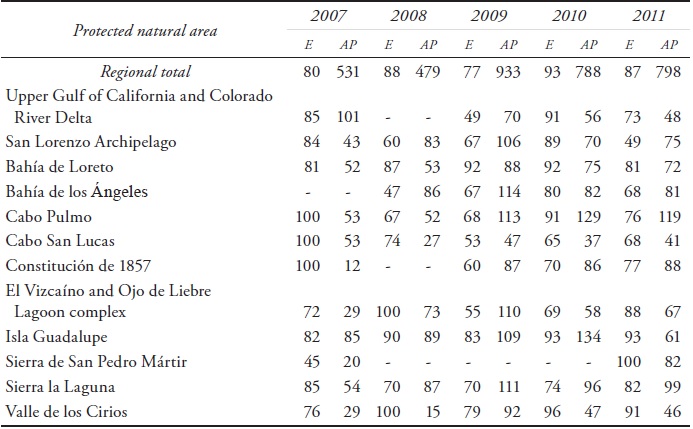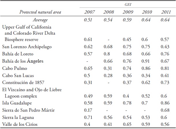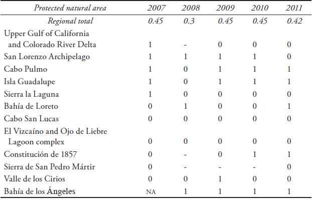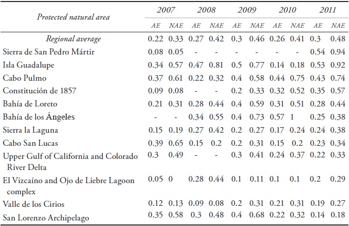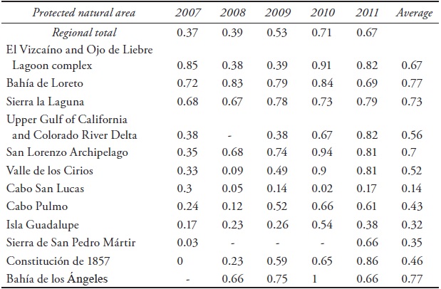 In the 2007-2011 period, the protected natural areas of the Baja California Peninsula increased their efficiency from 0.33 to 0.48 (on a scale of 0 to 1). This indicator contemplated both efficacy as a workload and the budget utilized. In 2011, the protected natural areas had more goals and fulfilled a greater number of them with a smaller budget (Table 4). Thus, an important element for consideration is that between 2007 and 2011, the budget destined for the protected natural areas declined from 30.4 million to 23.1 million pesos, which meant a decrease of the average budget per goal from 57 201 to 28 948 pesos.