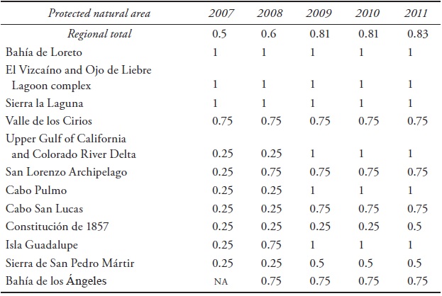 Between 2007 and 2011, the administration of the protected natural areas of the Baja California Peninsula performed better than before in relation to the incorporation of the principles of governance in its work (from 0.51 to 0.64). This means that in general, management teams are more efficient, efficacious, inclusive, and fair, and undertake a broader promotion of participation (Table 8).