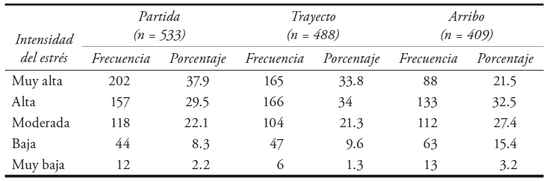 En cuanto a la presencia de situaciones estresantes asociadas con la partidatales como tener poco dinero para emprender la migración, contar con escasa información para cruzar la frontera o bien desconocer cómo cruzarla, entre otras–, 88.1 por ciento de los migrantes (533 casos) manifestaron haber experimentado alguna situación en este sentido, mientras que 11.9 por ciento (72 personas) señaló no haber vivido alguna experiencia de este tipo. De los que mencionaron haber pasado por una situación así, la intensidad con la que la vivieron va de alta a muy alta (cuadro 1).