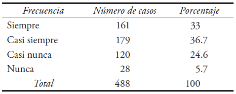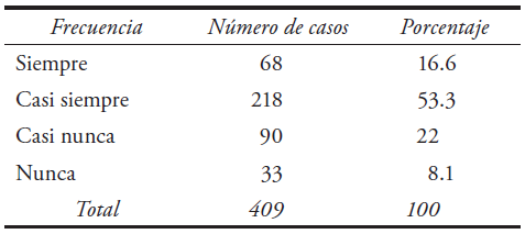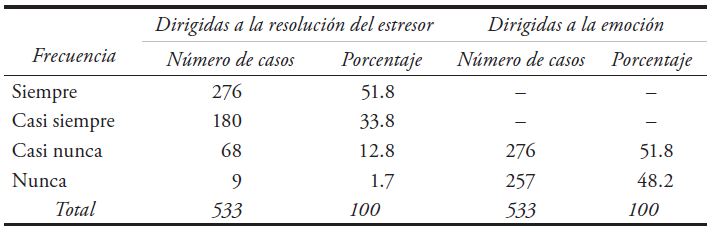 los 533 migrantes que mencionaron haber vivido una situación de estrés asociada a la partida utilizaron dos tipos de estrategias de enfrentamiento: las dirigidas a su resolución, cuyos indicadores hacen referencia a situaciones como superar una a una las dificultades que se presentan, pensar que es un reto que tenía que solucionar y/o buscar una solución. Un porcentaje muy alto de los migrantes reportaron usar siempre este tipo de estrategias (cuadro 2). Las otras utilizadas para enfrentar el estrés migratorio por la partida fueron las relacionadas con la emoción; esto es desesperarse, sentirse de mal humor o preocuparse. De acuerdo con lo señalado por los migrantes, este tipo de estrategias casi nunca o nunca las utilizaron.