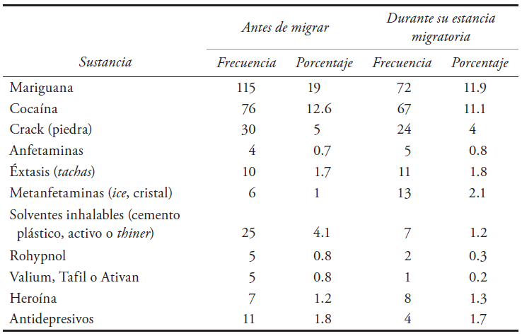 En cuanto al consumo de sustancias ilícitas, sobresale el hecho de que 33.6 por ciento (203 migrantes) mencionaron haber usado alguna droga al menos una vez en la vida. Las razones del consumo fueron diversas: lo han hecho para experimentar los efectos de la droga; dejar de sentir soledad, depresión o tensión; por invitación, especialmente de amigos, y como una forma de olvidar los problemas. Las drogas que se consumieron con mayor frecuencia fueron marihuana, cocaína, crack, solventes inhalables, éxtasis y metanfetaminas.