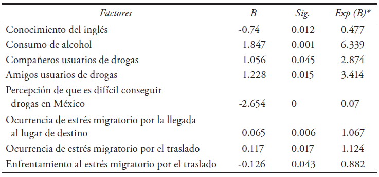 Vale precisar que, en lo que respecta a la determinación de presuntos factores predictores del consumo de drogas en este sector poblacional, se encontró que el uso de bebidas alcohólicas, la convivencia del migrante con algunos consumidores y la presencia de eventos estresantes propios de la migración son factores de riesgo para la utilización de drogas. En contraparte, la adquisición del inglés, solucionar eventos estresantes de la migración y tener una baja percepción de acceso a estas sustancias en México son componentes que protegen al migrante ante el consumo de drogas.