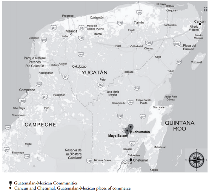 Once in the refugee camps in the Mexican state of Chiapas, the Guatemalans resumed their labor mobility, as documented in fieldwork: one, clandestine, close by, and others in incursions to neighboring states where the refugees were taken to temporarily work in archaeological zones. While this was happening, the relocation of the Chiapas camps to Campeche and Quintana Roo was planned, where the integration project included work diversification, which involved the Guatemalans’ incorporation into urban jobs in cities with a lot of tourism and other business activity.5 In addition, there was the option of returning home to Guatemala; some who returned were not able to reintegrate there and went back to Mexico. Some also went to the United States. Against this backdrop, the then ex-refugees from the communities of Maya Balam and Kuchumatán in Quintana Roo opened new pathways, consolidating intermittent itinerant regional and transnational trajectories to their places of origin and also for a long time to the United States.