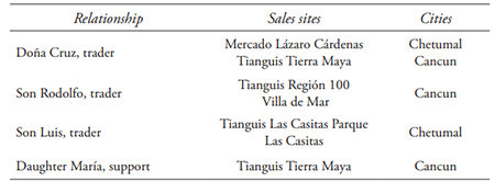 Some tensions about the hours of sale have emerged around this conflict: “They have been asked to sell from 3 in the morning until 9 in the morning and not from 3 until 12” [as takes place. There has been a dispute and over space because] “they give the market a bad image.” [Also, The Guatemalan women, a market representative said,] “don’t pay anything like the established tenants pay” (Anonymous, personal communication). One more complaint is about the type of sales that the Mexican-Guatemalan traders, female and male, make; they sell their products on a retail basis (in bags), unlike the established tenants, who sell by the kilo, which is the trade standard. The argument goes, “The people (customers) prefer to buy in bags” (Anonymous, personal communication), which represents a disadvantage for the established tenants. To resist these actions of hostility and exclusion, the Guatemalan vendors joined together and selected a community representative. Their union finally was able to settle these issues, with vendors staying put and keeping their current working hours. Now there are 40 spaces distributed among 87 vendors of the communities of Maya Balam, Kuchumatán, San Isidro la Laguna, Canlumil, Miguel Hidalgo, and Ávila Camacho; they are the first to go beyond the ties of kinship and friendship in terms of business expansion. In her case, Doña Cruz has her sales itinerary in Chetumal and Cancun, and has been able to place her sons in various business spaces with their own stalls in those cities (Table 1).