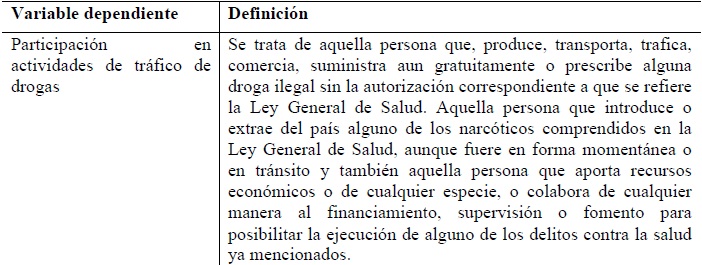 Los cuadros 2 y 3 muestran el conjunto de variables utilizadas en el estudio. Se proponen definiciones de cada una de ellas a partir de fuentes específicas,entre las que se incluye el Código Penal Federal, dependencias de gobierno relacionadas con el sistema penitenciario ydiversos estudios académicos.