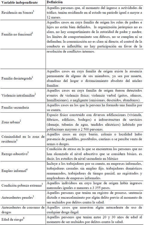 Para formular las hipótesis sobre factores contextuales y participación en el tráfico de drogas, se tomaron en cuenta las perspectivas argumentativas descritas en el primer apartado, retomando la idea de que el deterioro de las condiciones sociales y el debilitamiento en las formas de control del delito provocan que los individuos rompan las reglas a las que estaban sometidos tradicionalmente –anomia–, inclinándose hacia modos de vida que transgreden las normas y participando en actividades de tráfico de drogas.
