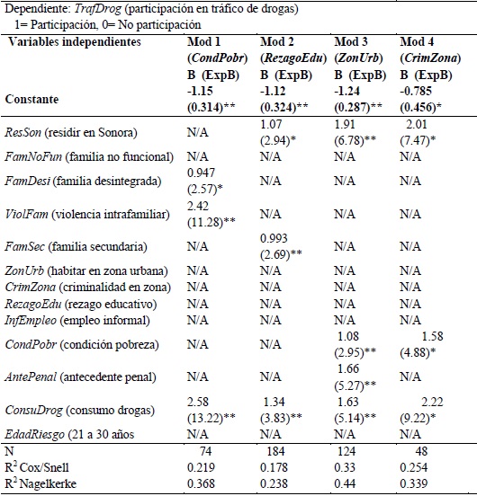 En esta sección de resultados se expone el análisis multivariado para cada una de las hipótesis planteadas. El cuadro 4 muestra los modelos y variables de acuerdo a la primera hipótesis, que refiere la relación entre deterioro social y participación en actividades de tráfico de drogas. En cada modelo se anotaron todas las variables independientes propuestas en el estudio, sin embargo, solamente se resaltan aquellas asociadas con la participación en el tráfico de drogas, utilizando el método backward.