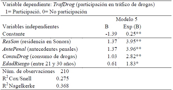 Se utilizó el mismo modelo logístico y se pusieron a prueba las variables independientes con el método backward. Como no se considera ninguna variable de selección, la asociación entre las variables dependientes y la participación en actividades de tráfico de drogas es estimada.