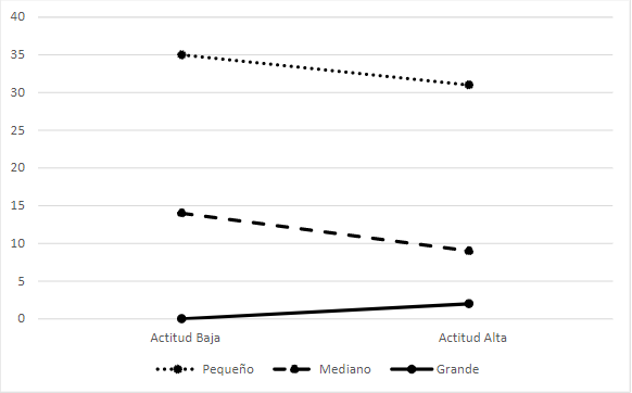 También se exploró la relación de acuerdo al tipo de productor. La clasificación se realizó con base en el número de hectáreas de la finca cafetera. La categoría pequeño incluyó a aquellos con fincas de 5 hectáreas o menos, la categoría mediano incluyó las fincas con 5.1 hectáreas y hasta 35 hectáreas, por su parte la categoría grande corresponde a aquellos con fincas de más de 35 hectáreas. La mayoría de los encuestados corresponde a la categoría de pequeños productores, seguido de los medianos y sólo dos grandes.