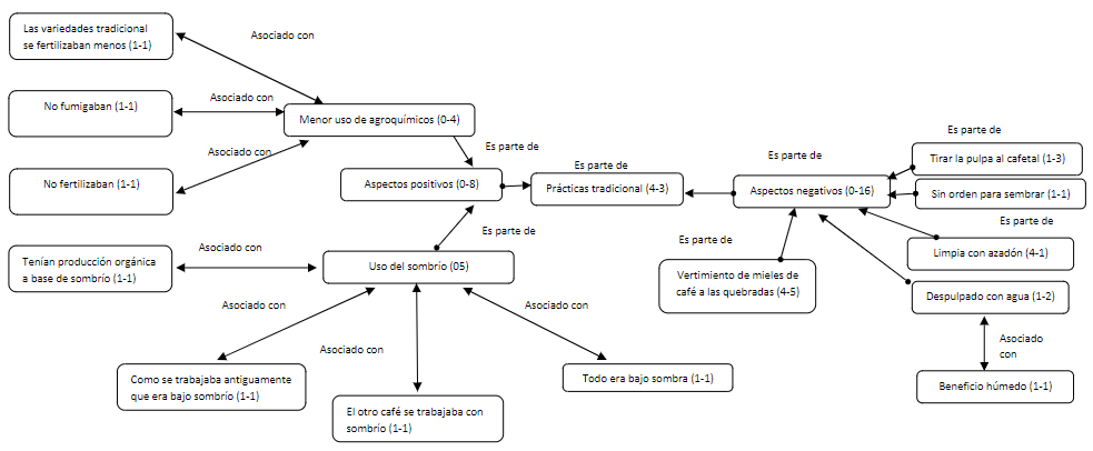 Los principales aspectos negativos asociados a la producción tradicional son los relacionados con los impactos al agua, debido a que en el cultivo tradicional el agua se utiliza para el beneficio del café, y las aguas mieles del proceso se vierten en ríos y arroyos. Aquí juega un papel importante la acentuación perceptiva, puesto que el agua es un recurso valioso para los productores en el proceso productivo tradicional.