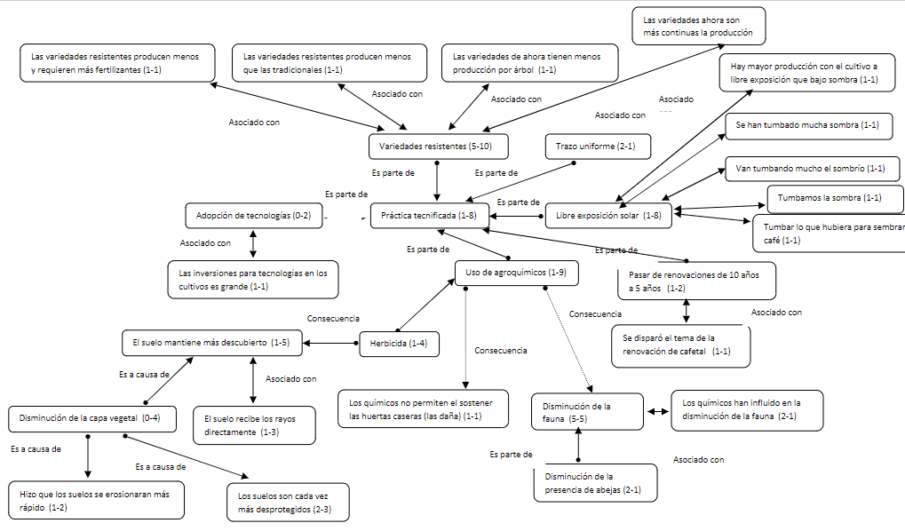 La percepción de los productores de la caficultura tradicional es que, si bien es más amigable con el ambiente, también conlleva prácticas percibidas como nocivas para el medio ambiente, entre ellas: 1) despulpado con agua, 2) vertimiento de mieles de café a las fuentes de agua, 3) el uso de azadón para el control de arvenses o maleza y 4) el manejo inadecuado de la pulpa del café. Por otra parte, la tecnificación se percibe como una opción para mejorar la productividad y hacer frente a la llegada de plagas y enfermedades a los cultivos de café. Entre los aspectos de la tecnificación identificados por los productores están el uso de variedades resistentes, adopción de tecnologías, trazos uniformes, cultivos a libre exposición, el uso de agroquímicos y las renovaciones de los cafetales. Las variedades resistentes se asocian con una productividad baja en comparación con las variedades tradicionales. Los cultivos a libre exposición se asocian con pérdida de sombra y la tala. El uso de agroquímicos se relaciona con la disminución de fauna, la ausencia de huertas caseras y la pérdida de la capa vegetal del suelo. Por otro lado, no se asociaron impactos negativos al trazo uniforme, ni a las renovaciones (ver Figura 3).