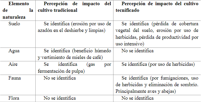 La Tabla 1 muestra que no se perciben daños a la flora en ninguna de las formas de cultivo, lo que no se exploró más a fondo dejando abierta una puerta para futura investigaciones. Se perciben afectaciones el suelo por ambos tipos de cultivo, pero el cultivo tecnificado se percibe como de mayor impacto. También se percibe que el cultivo tradicional afecta más al agua por su uso en el proceso de beneficio y el vertimiento de las mieles de café a fuentes hídricas. El cultivo tecnificado se aprecia como el más dañino para la fauna por la eliminación o disminución de la sombra, las fumigaciones y el uso de herbicidas.