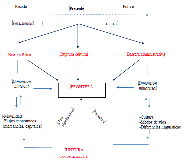 Partimos del supuesto de que la frontera es también una construcción social, un conjunto de prácticas y discursos que trascienden el espacio fronterizo hacia el resto de la sociedad. Por lo que coincidimos con Paasi (1991) en que la producción y reproducción de las fronteras constituye el proceso por medio del cual se produce el territorio en sus dimensiones institucionales y simbólicas. De ahí la concepción del territorio (trans)fronterizo como espacio vivido, percibido y apropiado, pero sobre todo revelador de prácticas significativas, de narrativas construidas colectivamente, y de nexos y fracturas identitarias.
