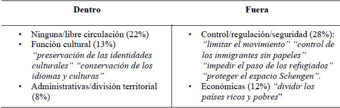 Las funciones que los actores encuestados atribuyen a las fronteras en la Europa de hoy pueden jerarquizarse a partir de una relación dentro/fuera implícita en el discurso y que reenvía a las fronteras internas y externas de la Unión Europea.
