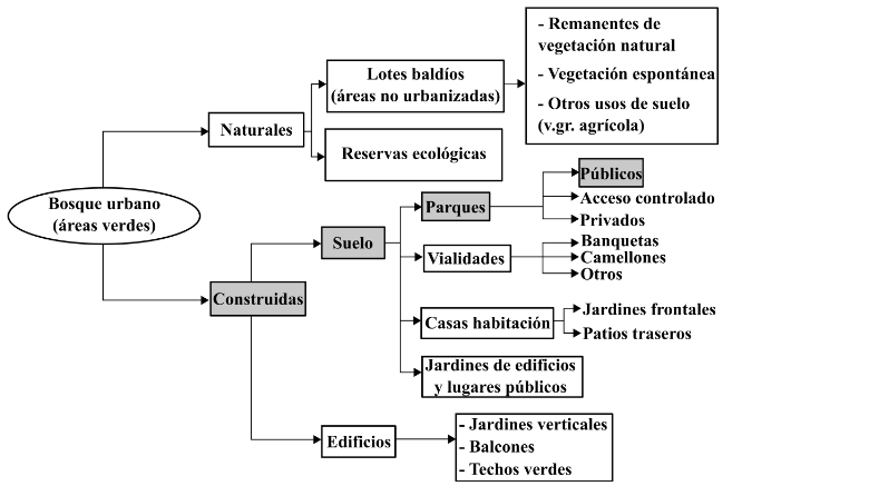 El bosque urbano se compone de los árboles, arbustos y vegetación herbácea asociada a éstos, que se encuentran dentro de los límites de una ciudad. El bosque también incluye el arbolado de alineación en banquetas de calles, avenidas, camellones, y en general toda formación vegetal dentro de una ciudad ( Benavides-Meza y Fernández-Grandizo, 2012 ) (gráfica 1). A su vez, el bosque urbano, junto con las corrientes y cuerpos de agua, forman lo que se conoce como ecosistema urbano, mismo que Bolund y Hunhammar (1999) definen como espacios verdes y azules que se localizan dentro del área urbana.