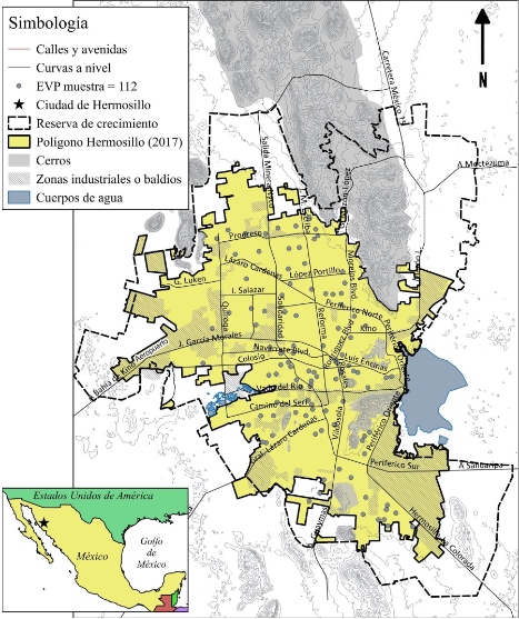 La ciudad de Hermosillo se ubica en los 29° 04’ 30.24” de latitud norte y 110° 57’ 32.17” de longitud oeste, en el estado de Sonora al noroeste de México (véase mapa 1 en el apartado metodológico), en la bioregión del Desierto de Sonora. El clima es de tipo BWh o árido muy seco de acuerdo a la clasificación de Köppen, con valores promedio anuales de precipitación y temperatura de 356 mm y 25 °C, respectivamente. Según datos de la Estación Hermosillo Norte de la Comisión Nacional de Aguas (Conagua) (clave 26-139) para el periodo de 1961-2016, los meses de junio-septiembre la temperatura máxima puede alcanzar los 40-41 °C y la temperatura máxima extrema se registró el mes de junio con 49.5 °C ( Sánchez, 2014 ); por otro lado, la evaporación potencial promedio es de 2 602 mm.