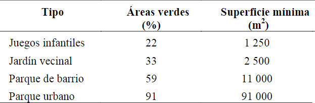 Asimismo, la Sedesol (1999) describe un programa arquitectónico general para las áreas recreativas urbanas de México, que posee una sugerencia implícita de CV. Aunque este sistema no precisa que la superficie debe estar por completo cubierta de vegetación, más bien se refiere a éstas como zonas verdes, bosques o áreas libres (cuadro 1).