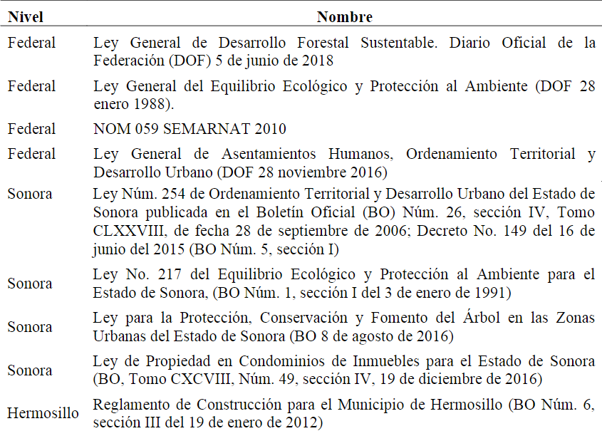 El estado actual de los EVP de la ciudad de Hermosillo es resultado de una política pública que los afecta en cantidad y calidad. Asimismo, esta situación influye en las características generales del bosque urbano y los servicios ecosistémicos que presta. La falta de sostenibilidad del bosque urbano de Hermosillo queda de manifiesto en lo que en una ocasión un empresario promotor del paisajismo xérico comentó: “si todos los miles de árboles que escuchamos que se han plantado en Hermosillo se hubieran logrado, Hermosillo fuera una selva”13 , haciendo referencia a la utilización de especies no adaptadas al desierto sonorense, así como al nulo seguimiento y mantenimiento de las áreas reforestadas. Evidentemente, este esfuerzo público no se ha visto reflejado en el enverdecimiento de la ciudad.14 En el cuadro 2 se muestra un resumen de las leyes y reglamentos que inciden en los EVP de la ciudad de Hermosillo, y en las siguientes secciones de este apartado se hace un breve análisis de éstas.