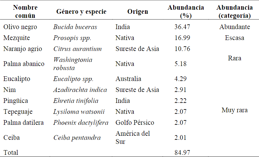 Para conocer en qué medida se cumplía con el uso de vegetación natural y no importada en los EVP, se analizó una muestra de 112 EVP distribuidos homogéneamente en la ciudad. Se registraron 6 065 árboles pertenecientes a 66 especímenes. Alrededor del 85 % del patrón de reforestación estaba representado por 10 especies ( cuadro 4 ). La proporción de flora de la región promedio por EVP fue de 38 por ciento (rango del 0 al 100 %), se identificaron 21 diferentes especies de las cuales 10 pertenecían a una sola familia de plantas –Fabaceae (leguminosas)– y 10, a pesar de ser autóctonas, provienen de ambientes riparios o de mayor humedad a la local, por ejemplo: uvalama (Vitex mollis), guamúchil (Pithecellobium dulce), amapa (Tabebuia impetiginosa), guasima (Guazuma ulmifolia) y mimbre (Chilopsis linearis). Las plantas nativas más importantes, ya sea por su abundancia o distribución, fueron el mezquite, palma abanico, tepeguaje y guamúchil.