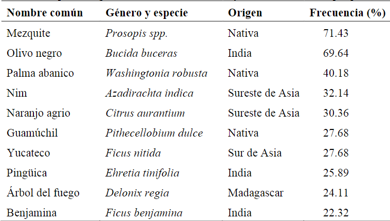 La frecuencia es un indicador que mide la presencia o ausencia de una especie en un EVP. Por lo tanto, es una medida de la distribución geográfica de una especie en la ciudad. En este sentido, las especies mejor distribuidas fueron mezquite, olivo negro y palma abanico (cuadro 5).