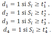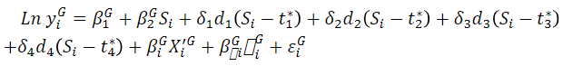 Además, se requiere calcular un modelo que pueda captar la continuidad de la variable de escolaridad en la regresión, de otra forma se tendrían resultados que si bien, captarían el efecto medio por cada nivel educativo para cada colectivo de trabajadores, perderían el efecto continuo esperado sobre los salarios. Precisamente, para poder realizar comparaciones de los pronósticos sobre los salarios a lo largo de cada nivel educativo, se ha transformado la ecuación (1) de la siguiente forma, considerando umbrales para cada corte de grupo educativo, expresada en la ecuación (2) como sigue: