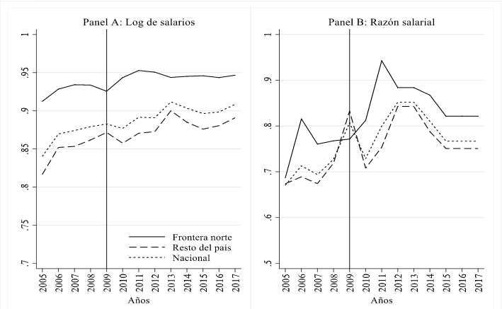 En todo el período con excepción del 2009, la razón salarial presenta mejor posición en la región fronteriza (Panel A).
