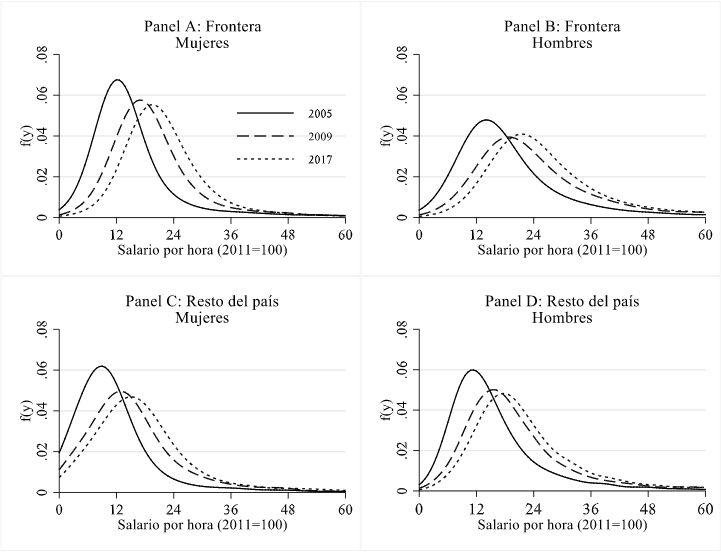 Es posible concluir aquí que, de los páneles A y C, las mujeres en la manufactura de la frontera norte presentan mejor posición que sus homólogas en el resto del país. Además, es clara la forma en que la crisis de 2009 afectó sobremanera a este colectivo, y apenas es suficiente la recuperación en sus niveles salariales hacia 2017. Se observa que la función de densidad de los salarios reales se desplazó más a la derecha en niveles de entre 30 y 40 pesos la hora, pero en menor proporción que la de los hombres (páneles A y B).