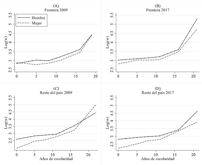 Este estudio muestra evidencia de diferenciales salariales persistentes con respecto de las mujeres tanto en la FN como en el resto del país. Los resultados se presentan considerando para el sector manufacturero un periodo de análisis que va de 2005 a 2017; y con la aplicación de técnicas no paramétricas en conjunto con la regresión de tipo Spline, se permite variar la pendiente de los efectos por escolaridad en cada colectivo de trabajadores. Los rendimientos son superiores para el colectivo de hombres, resultando éstos en el período de 8 por ciento mayores al de la mujer, con 6.9 por ciento en el resto del país. En tanto que en la frontera, de forma respectiva, fueron de 8.1 y 5.3 por ciento de premio al nivel educativo superior.