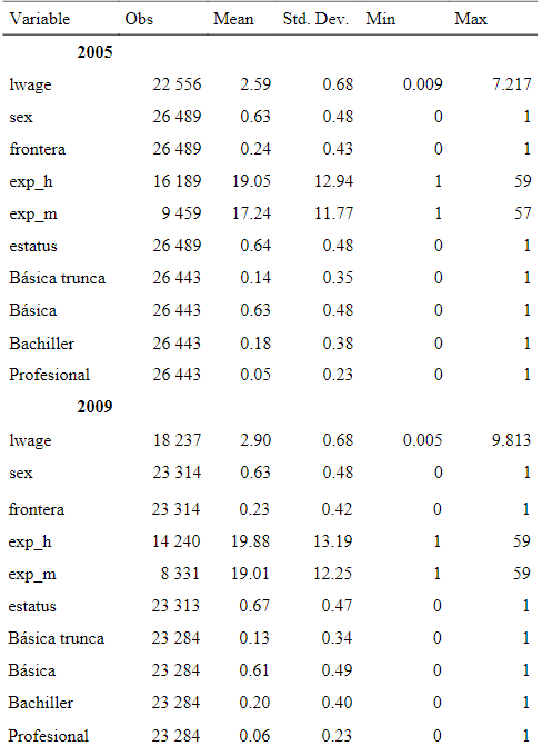La estadística descriptiva del cuadro 1 exhibe las variables más relevantes del estudio. En él se aprecia que en la frontera norte las mujeres representan 34 por ciento del empleo en la manufactura, 2 por ciento mayor al promedio nacional, suceso asociado quizá a las actividades manufactureras que se desarrollan en la región, cuya presencia caracteriza de manera favorable la participación femenina. Sin embargo, también se exteriorizan contrastes socio-culturales-demográficos que distinguen geográficamente las dinámicas laborales regionales y nacionales. No obstante lo anterior, es relevante mencionar que, tanto a nivel nacional como en la región frontera, existe una predominancia del empleo masculino en la industria.