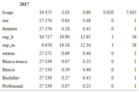El estudio empírico se enfoca en la frontera norte y en el resto del país, donde el primero suma la población trabajadora de las seis entidades federativas a lo largo de la franja fronteriza colindante con Estados Unidos, la cual contribuye con más del 30 por ciento del Producto Interno Bruto del sector manufacturero en su conjunto en México. Durante los años 2005 al 2017 el sector dio trabajo al 34 por ciento de los ocupados en la región, de acuerdo de las bases de datos de la ENOE ( Inegi, 2005 al 2017 ).