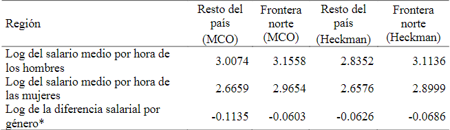 Al comparar el ingreso por hora entre regiones se encontró que en la frontera norte los trabajadores de ambos sexos perciben alrededor de 3 pesos más; aunque las horas laboradas por semana fueron similares entre géneros y regiones. Por sexo, las mujeres perciben remuneraciones medias por hora inferiores a las de los hombres en aproximadamente 20 por ciento en la frontera norte, comportamiento que se estima en 18 por ciento para el país. Sin embargo, la frontera norte goza en promedio de apenas un 14 por ciento, cerrando la brecha por género en esta zona geográfica en favor de la mujer. En este estudio se argumenta que han transcurrido ya 17 años durante los cuales el problema persiste en igual dimensión y los salarios permanecen, en términos reales, estancados.