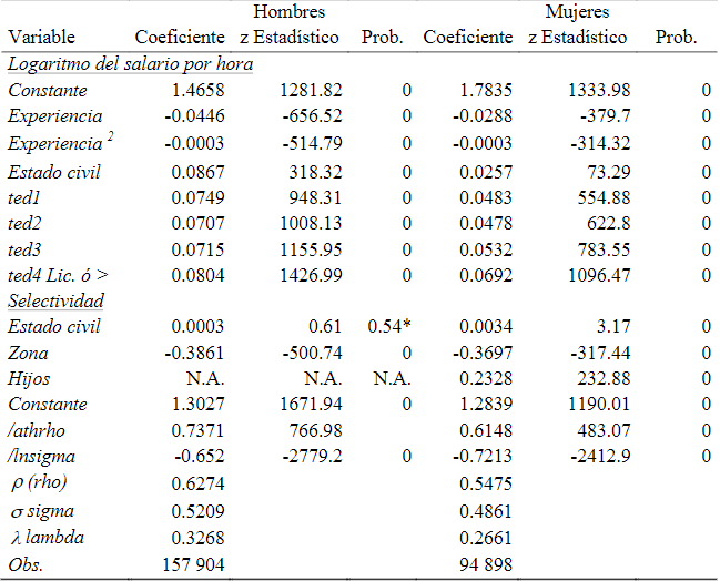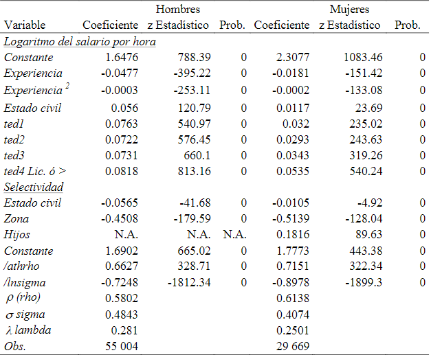 La presencia de un sesgo de selección es relevante al realizar los cálculos y se obtuvieron cambios atenuados en los modelos por Mínimos Cuadrados (MCO), con excepción de una sobrevaloración que se observa en los salarios de los hombres; lo que nos permite establecer con determinación que los resultados son robustos y consistentes en las estimaciones realizadas por Heckman (1979) .