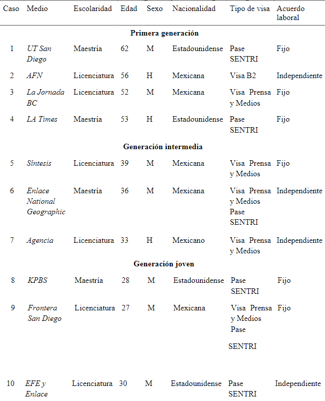 Los sujetos de estudio son diez periodistas, siete mujeres y tres hombres de entre 27 y 61 años de edad, con estudios de nivel universitario y hasta maestría, que colaboraron o colaboran como reporteros asalariados o independientes para medios de periodismo escrito de San Diego y Los Ángeles, en Estados Unidos, y de Tijuana, en México, y que son corresponsales de agencias a nivel nacional e internacional.