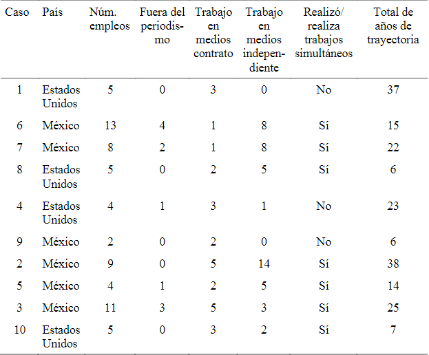 En el cuadro 2 se sintetizan los principales cambios en las trayectorias, el número de empleos que han tenido, que van de 5 a 13, siendo el más estable y formal el caso 1, de Estados Unidos, y el caso 9, de México. Ambas son trayectorias en los extremos de la muestra, ya que una es de la primera generación de periodistas y la otra es de la generación joven. En este cuadro también se puede observar que se van empleando a lo largo de la trayectoria tanto en trabajos por contrato como en actividades como independientes, y que se cuenta con más de un empleo simultáneo, lo que parece una constante a pesar de las especificidades de la generación, las cuales se irán discutiendo en los siguientes apartados.