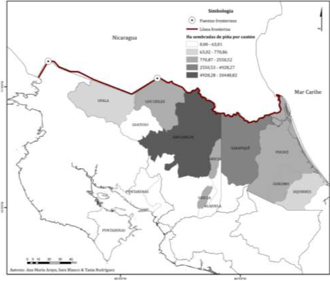 Desde los años ochenta, Costa Rica ha promovido el cultivo de piña de forma intensiva, con el fin de desarrollar cultivos no tradicionales alternativos al café y al banano que fueran más rentables en el mercado mundial. Con tan solo 51 100 km2, Costa Rica es hoy en día el principal exportador de piña del mundo. La constante expansión de este cultivo se ha generado a través de diferentes incentivos por parte del Estado costarricense, y se ha venido localizando mayoritariamente en la frontera norte, colindante con Nicaragua, específicamente en los cantones de Upala, Guatuso y Los Chiles, que concentran alrededor de un 53 por ciento de la producción nacional de piña (Rodríguez, Obando y Acuña, 2018).