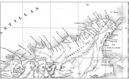 Para ejecutar este tercer medio de reducción, sin embargo, había que solicitar el consentimiento del gobierno de Venezuela, tanto para establecer en Garabulla ( mapa 2 ) un hospital militar, y también para proveer al ejército en aquel lugar con pan, agua y otros artículos si fuese conveniente. Para reducir los gastos, las tropas tendrían que mantenerse siempre listas con “uno o dos buques en el puerto de Riohacha para conducirlos a Santa Marta, Cartagena o donde se destinen” ( AGN, 1843, f. 237v ).