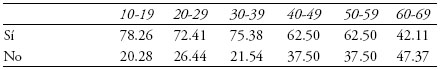 7) Un fenómeno cada día más común, como hemos notado en las páginas anteriores, es la acelerada rotación de las plantillas de jugadores. Nuestro sondeo preguntó a los aficionados su parecer respecto a esta rotación. Los resultados arrojan lo siguiente: los aficionados jóvenes parecen estar más de acuerdo (con grados de aprobación que fluctúan entre 72.41 y 78.26%) con la necesidad de la rotación frecuente de jugadores que los aficionados mayores de 40 años (cuyo grado de aprobación va de sólo 42.11% entre los aficionados en el rango 60-69 años, hasta un 62.50% en los rangos 50-59 y 60-69 años). Podemos apreciar que aunque la aprobación es mayoritaria (en todos los rangos de edad) en comparación con la reprobación, la aceptación de la rotación de jugadores en todos los casos es mayor entre los jóvenes que entre los encuestados de una edad más avanzada.